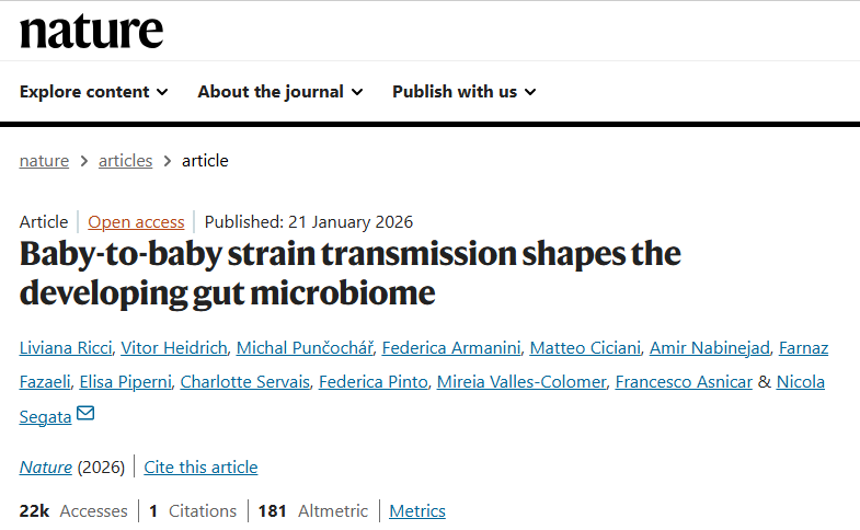 2026年1月21日,意大利特伦托大学Nicola Segata团队在Nature上发表题为"Baby-to-baby strain transmission shapes the developing gut microbiome"的论文,该研究报告了一项宏基因调查,显示婴儿间的微生物群传播在婴儿第一年内非常广泛,并指出婴儿期的社交互动是推动婴儿微生物组发育的关键因素。